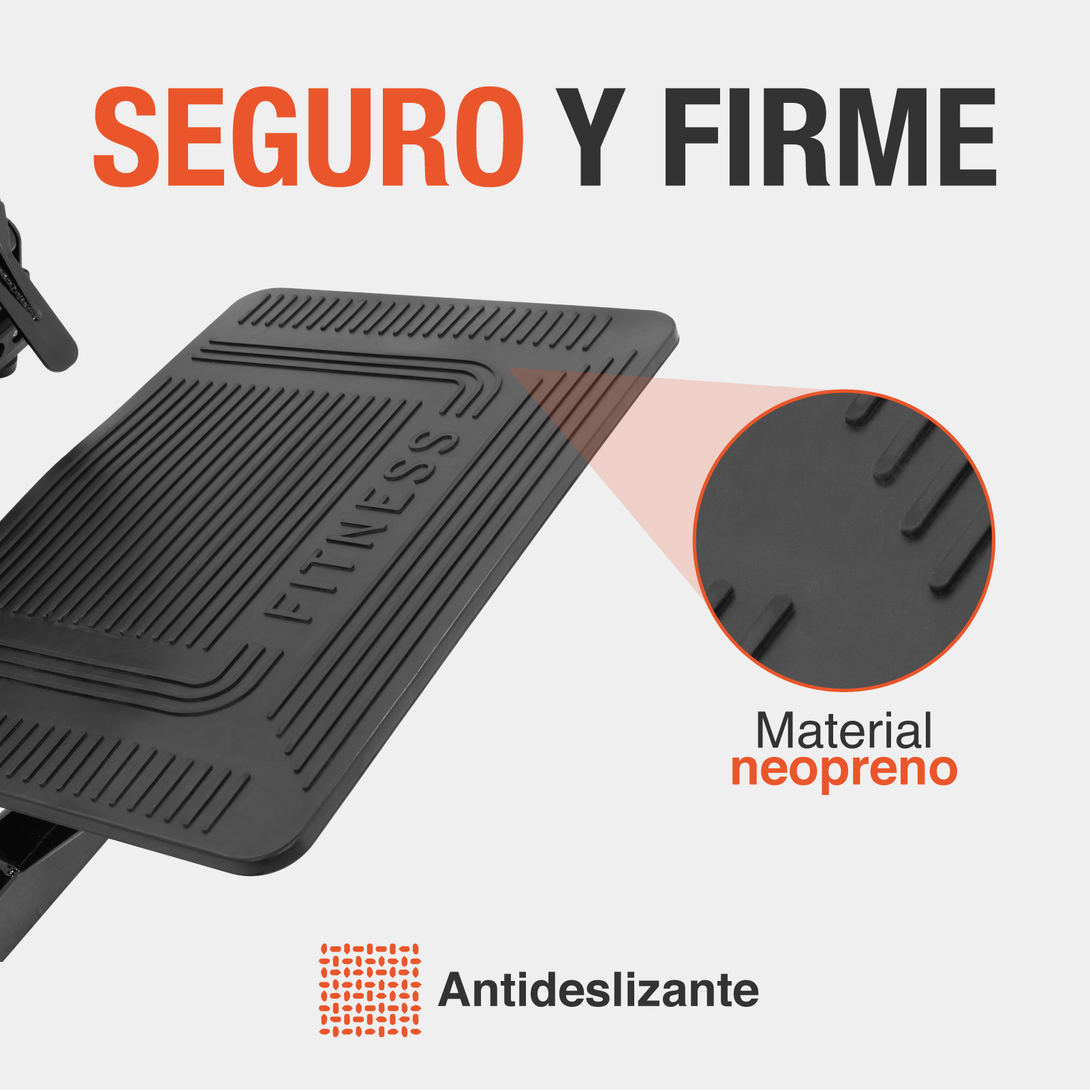 Su estructura sólida está fabricada con materiales de alta calidad como acero y aluminio, e incorpora rodamientos de precisión en los puntos de giro, asegurando un movimiento suave y controlado. Los reposapiés recubiertos de neopreno antideslizante proporcionan estabilidad y seguridad durante el uso.