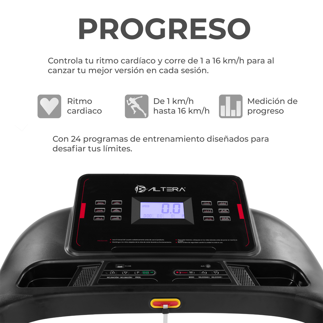 PROGRESO . Monitorea tu rendimiento en tiempo real con el medidor de ritmo cardíaco integrado. Controla la intensidad con el sistema de inclinación ajustable y alcanza tus metas de velocidad con un rango de 1 a 16 km/h. ¡Haz de cada sesión una aventura hacia tu mejor versión!