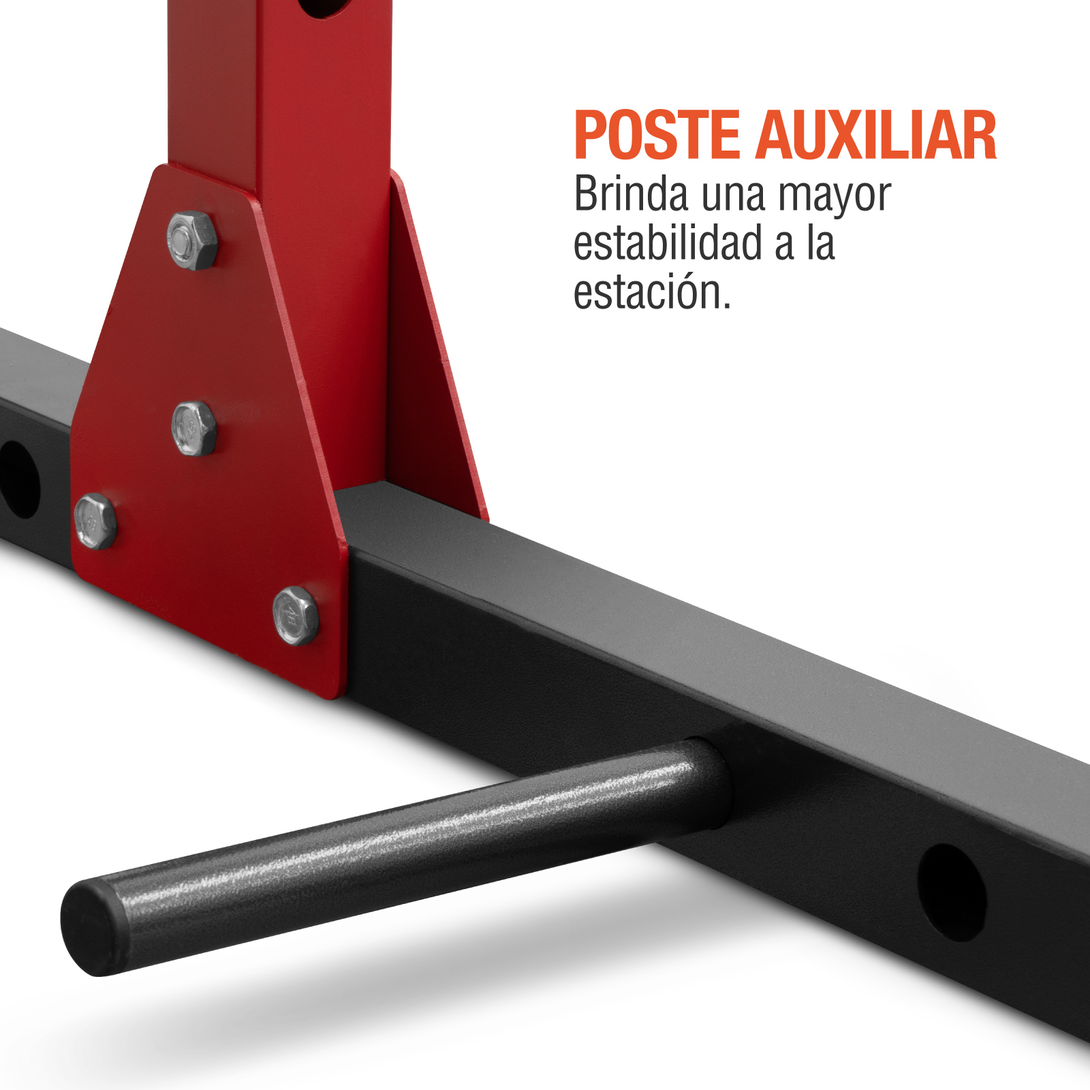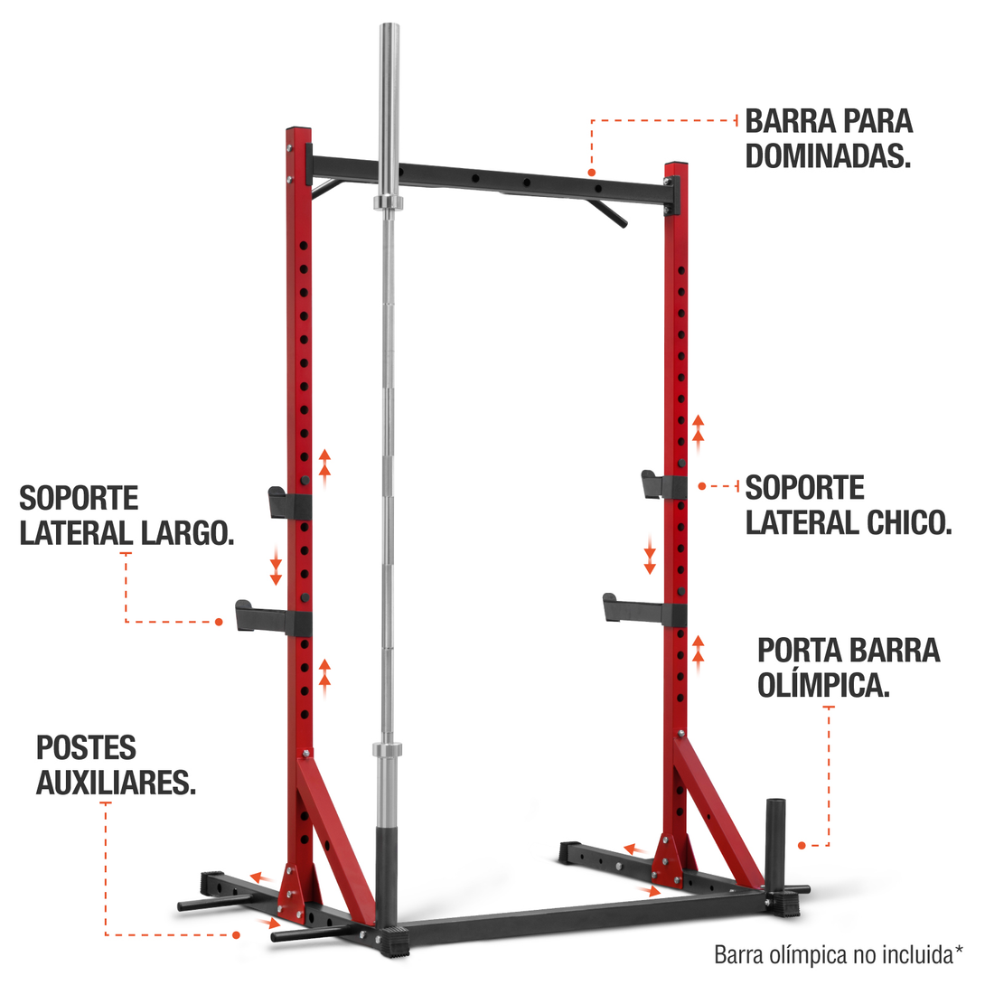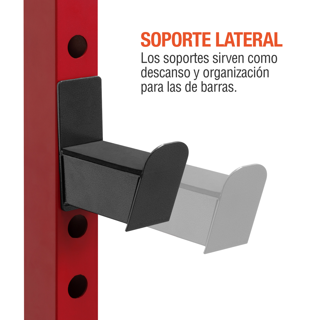 ACCESORIOS ADICIONALES: También podrás encontrar 2 soportes para barras olímpicas de 25 cm, 4 barras ajustables hasta en 3 posiciones en su parte inferior de 20 cm que podrás usar para rutinas con ligas de resistencia y una barra para abdominales de 113 cm.