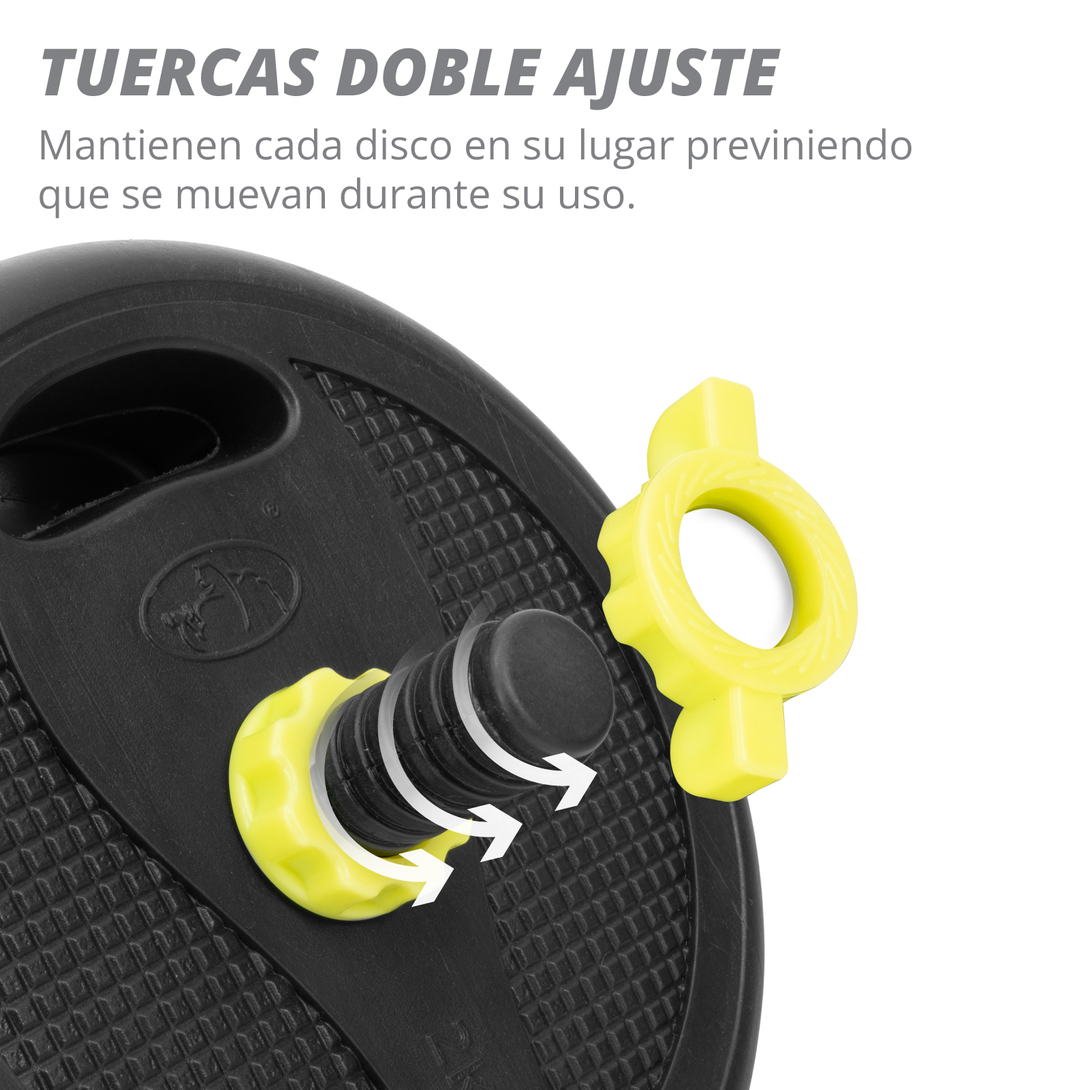 SEGURO DE USAR. El set contiene 8 tuercas de seguridad que mantienen cada disco en su lugar previniendo que estos se muevan durante su uso. El mango de las mancuernas está forrado de goma antideslizante para asegurar un mejor agarre.