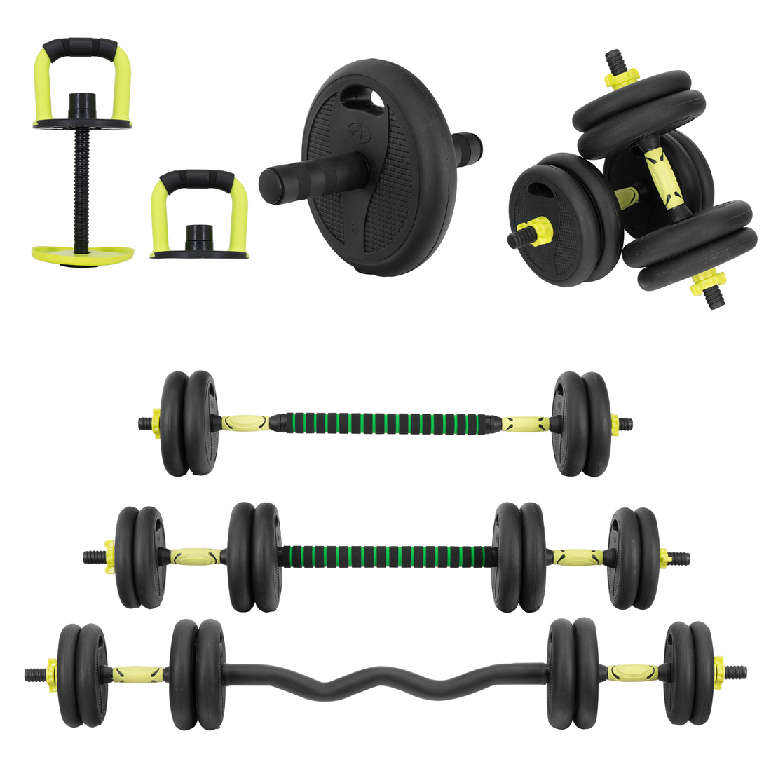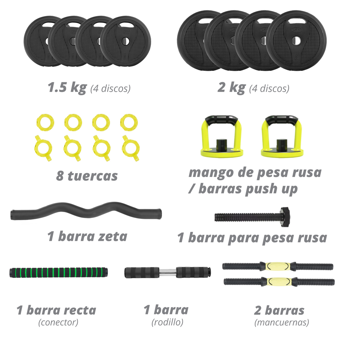 SET 4 EN 1. Cuenta con una barra conectora que sirve para convertir el par de mancuernas en una pesa de barra recta. Además, cuenta con un rodillo para armar una rueda abdominal y un agarre para conversión a pesa rusa. Este set satisface todas tus necesidades de entrenamiento.