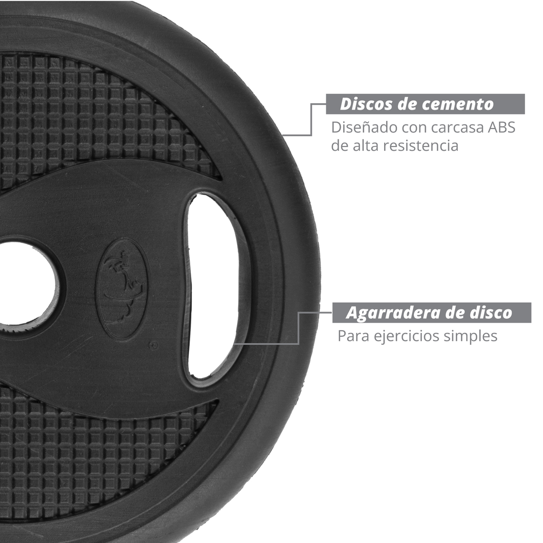 MATERIALES DURADEROS. Todos los discos están construidos de cemento, con una carcasa ABS de alta resistencia. Su barra conectora está hecha de metal y tiene un recubrimiento de espuma suave y transpirable de 40 mm de espesor.